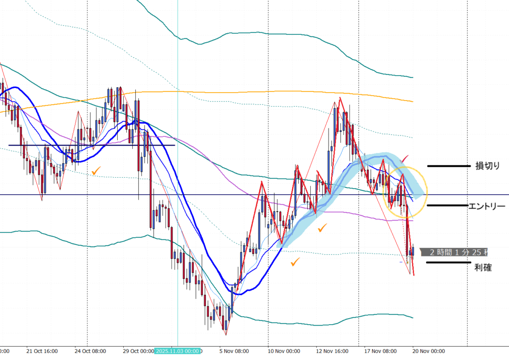 2025/11/19 エントリー EURUSD エントリー履歴 X Facebook はてブ LINE コピー 2025.11.202025.11.27 エントリーを紹介します。 目次 2025/11/19 EURUSD使用した手法 2025/11/19 EURUSD エントリー根拠 4時間足が上昇トレンドから下落トレンドへとトレンド転換後 20MAが上向きに転換し 20MAに対して上長ヒゲのピンバー、かつ包み足で反発を確認してエントリー ⇒リスクリワード(RR)1:1.5で利確しました。 使用した手法 ▼▼▼詳細はこちらのページです 使用している手法、インジケーター、環境認識