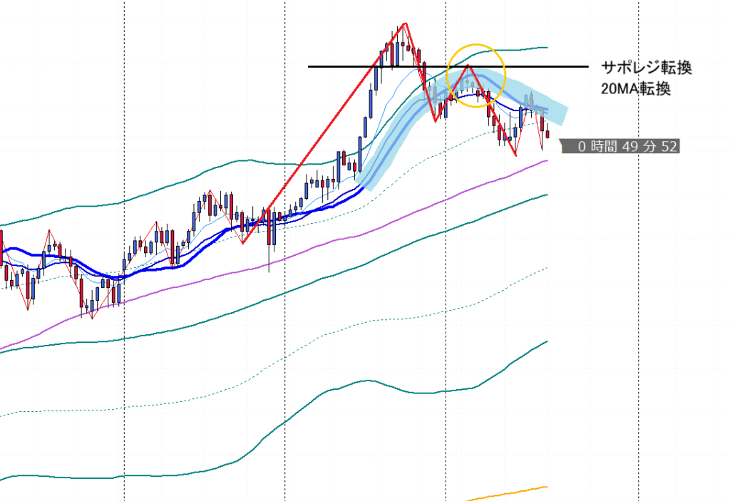 • 4時間足が上昇トレンドから下落トレンドへとトレンド転換後
