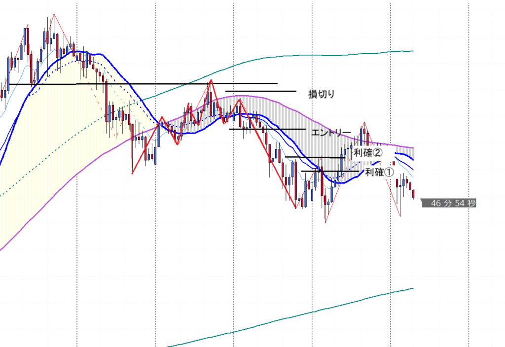 • 順調に押し下げたが、1時間足でWボトムをつけてネックラインを上にブレイクしたところで①の利確